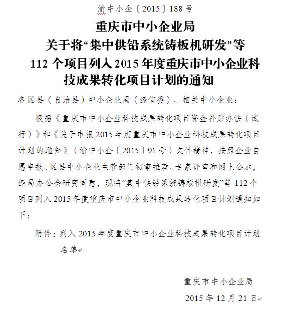 多年以來,重慶城建經(jīng)濟(jì)(集團(tuán))重慶綠色科技開發(fā)有限公司與重慶房地產(chǎn)職業(yè)學(xué)院進(jìn)行產(chǎn)學(xué)研合作,堅(jiān)持創(chuàng)新發(fā)展,研發(fā)了“中國(guó)創(chuàng)造”“互聯(lián)網(wǎng)+多色溫防霧霾亮度可調(diào)智能控制系統(tǒng)及LED智能燈具”技術(shù)。該技術(shù)自2015年7月22日申報(bào)2015年度重慶市中小企業(yè)科技成果轉(zhuǎn)化項(xiàng)目計(jì)劃后,現(xiàn)已于2015年12月21日成功列入科技成果轉(zhuǎn)化項(xiàng)目計(jì)劃。通知文件如下: