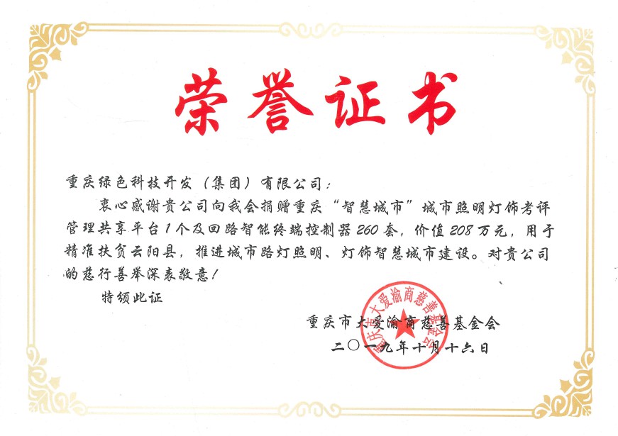 10月16日,重慶綠色科技開(kāi)發(fā)(集團(tuán))有限公司為支持國(guó)家級(jí)重點(diǎn)貧困縣精準(zhǔn)扶貧工作,積極推進(jìn)智慧城市建設(shè),通過(guò)重慶市大愛(ài)渝商慈善基金會(huì),向云陽(yáng)縣市政設(shè)施管理所捐建了回路智能終端控制器260套,以及配套建設(shè)重慶“智慧城市”城市照明燈飾四級(jí)考評(píng)管理共享平臺(tái)1個(gè),總價(jià)208萬(wàn)元,用于解決云陽(yáng)縣城市路燈照明智能化管理的問(wèn)題,幫助云陽(yáng)縣實(shí)現(xiàn)市政府在《重慶市城市綜合管理提升行動(dòng)方案》提出的城市照明“一把閘刀”管理的要求。