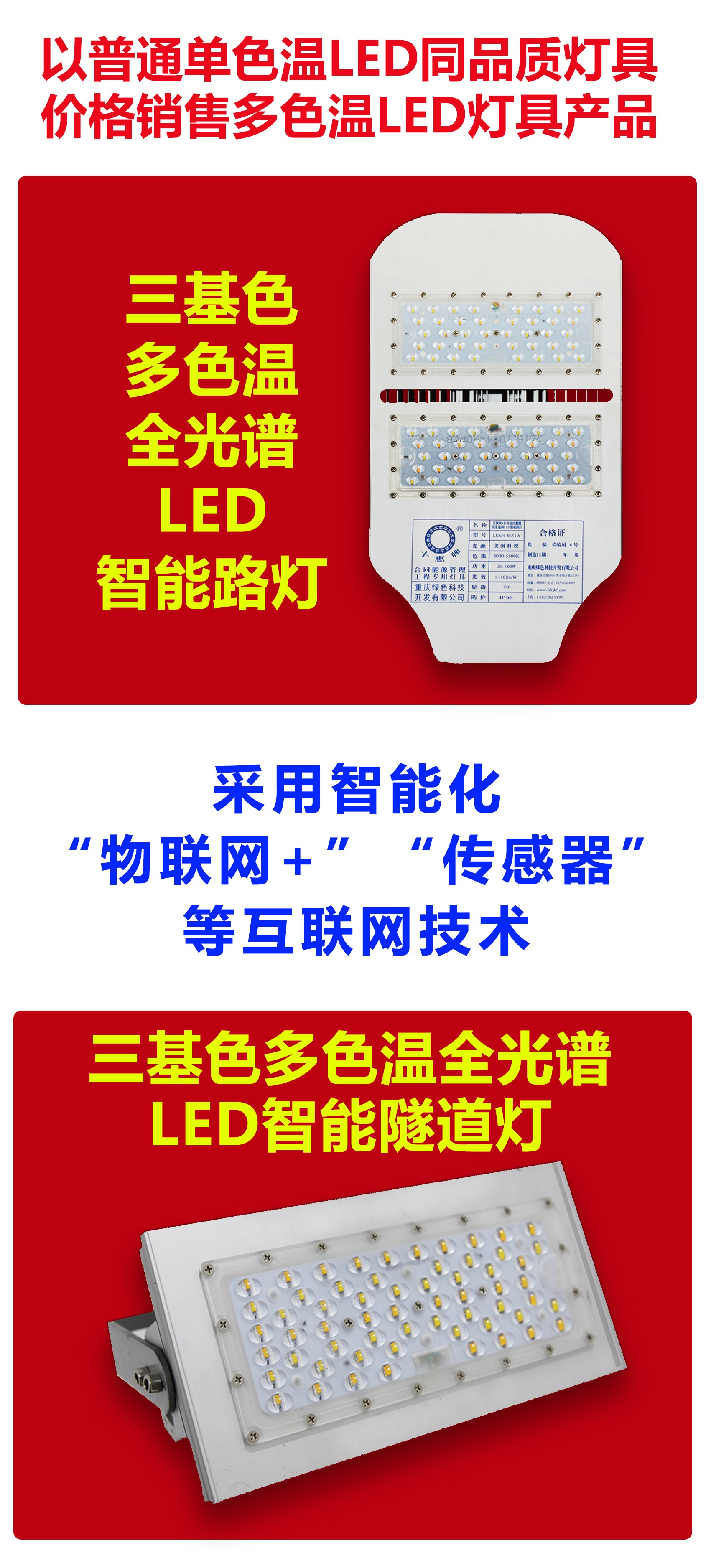 重慶“中國創(chuàng)造”三基色多色溫全光譜LED人工智能路燈技術(shù)是世界城市路燈照明領(lǐng)域淘汰普通單色溫LED路燈的先進(jìn)制造技術(shù),市場前景巨大。為了進(jìn)一步開拓多色溫LED智能路燈照明市場,重慶綠色科技開發(fā)(集團(tuán))有限公司(以下簡稱我司)擬尋覓誠實(shí)守信、具有實(shí)力的LED電源制造公司、LED路燈燈具制造公司合作,整合資源優(yōu)勢,免費(fèi)開放多色溫全光譜LED智能路燈、智能終端控制器制造技術(shù),在合作期間免費(fèi)提供國家級“智慧城市”城市照明夜景燈飾四級考評管理共享平臺(tái)使用,通過技術(shù)共享,實(shí)現(xiàn)共同對外銷售,達(dá)到雙贏的目的,請有意合作者與我們聯(lián)系……