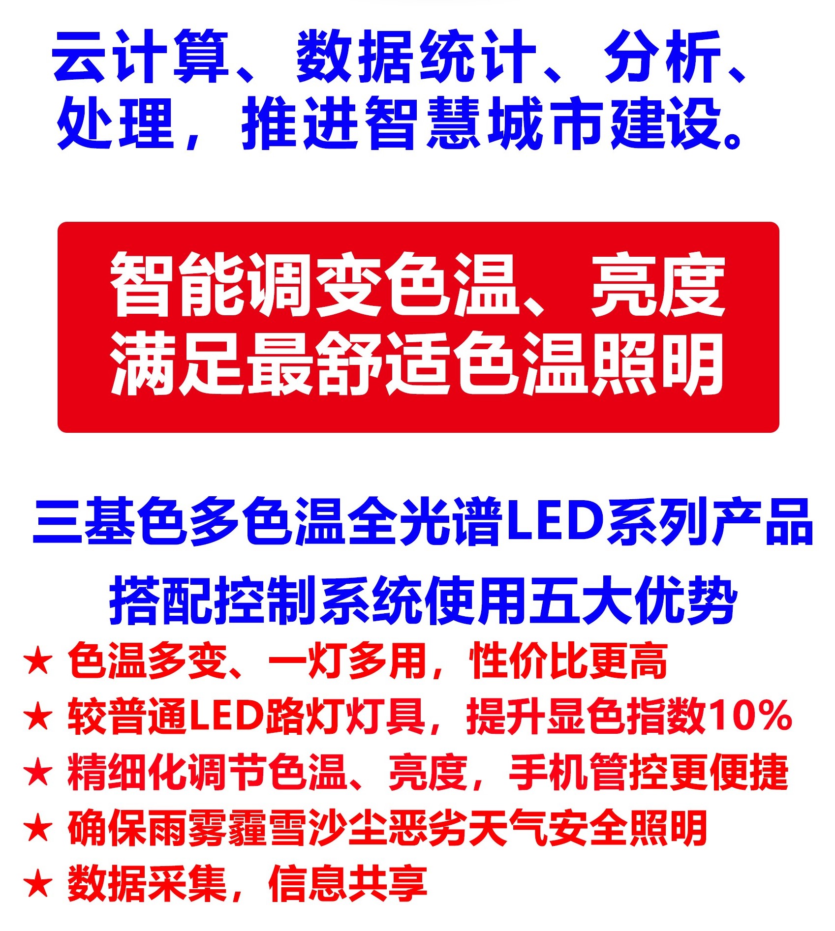 四、一盞三基色多色溫全光譜LED人工智能路燈色溫照明,可替代多盞普通單色溫LED路燈色溫照明,性價(jià)比更高,有效提高顯色指數(shù)、光效10%,色彩鮮艷度15%,燈具使用壽命更長。