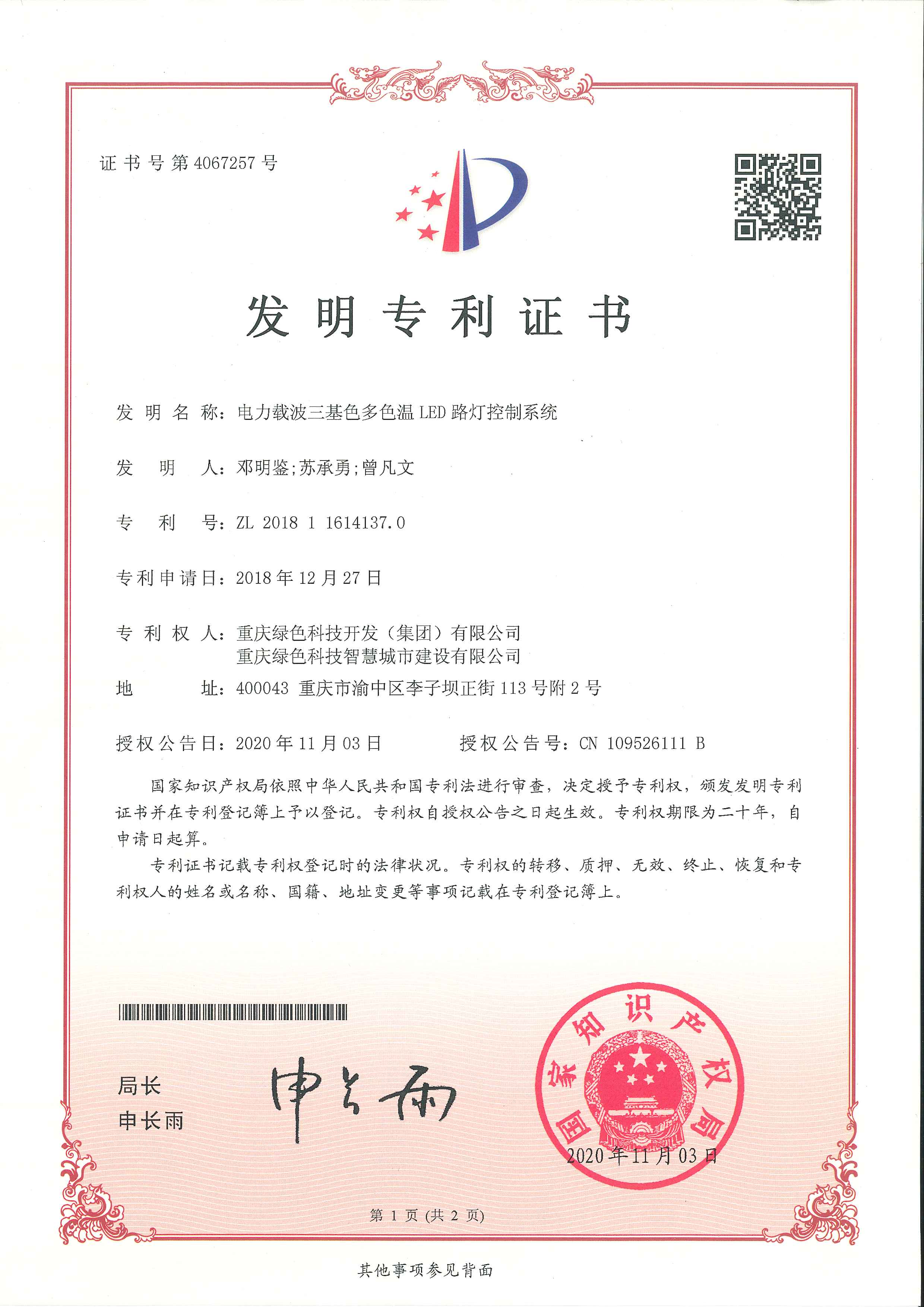 《電力載波三基色多色溫LED路燈控制系統》(專利號:ZL 2018 1 1614137.0)